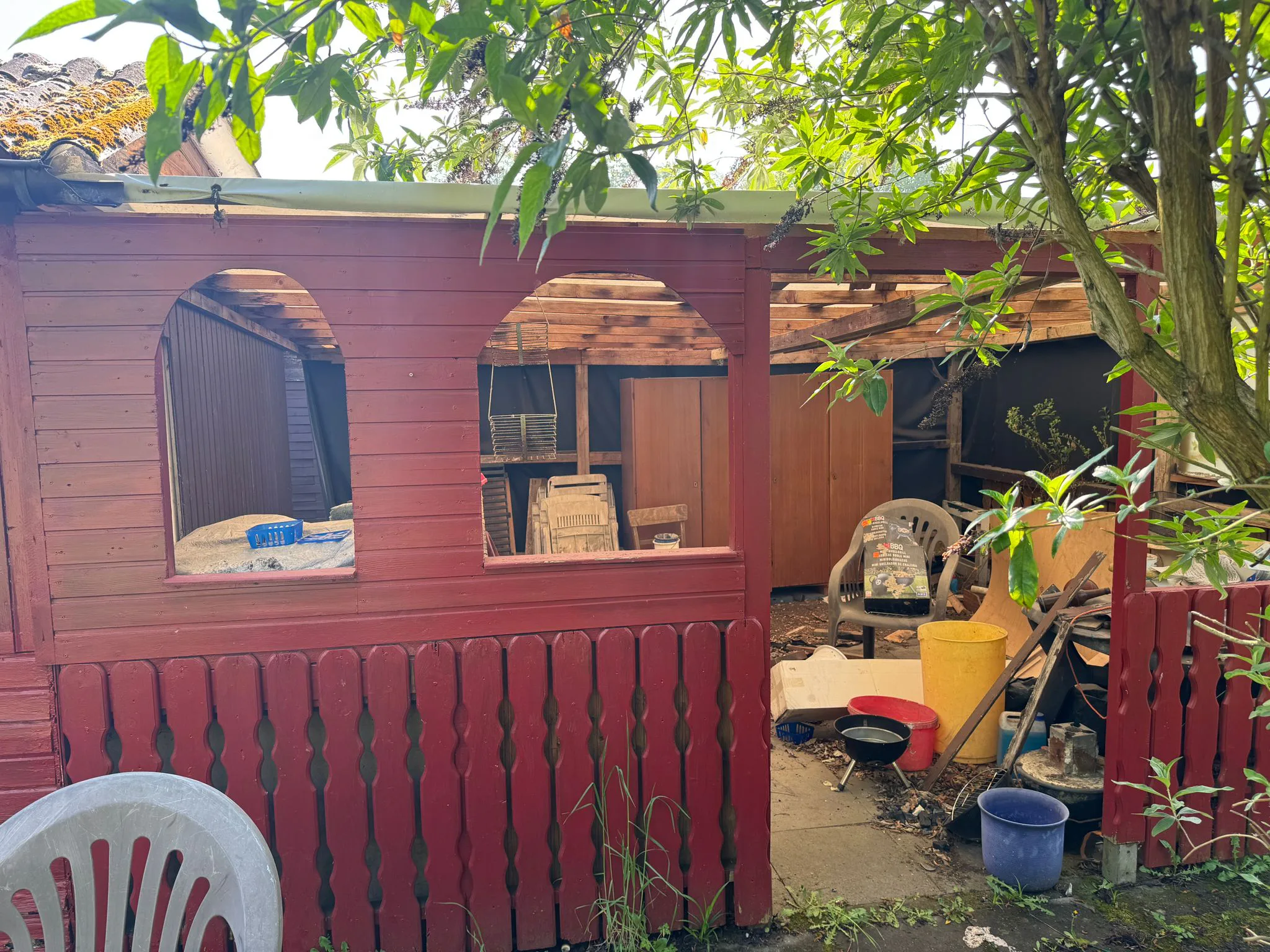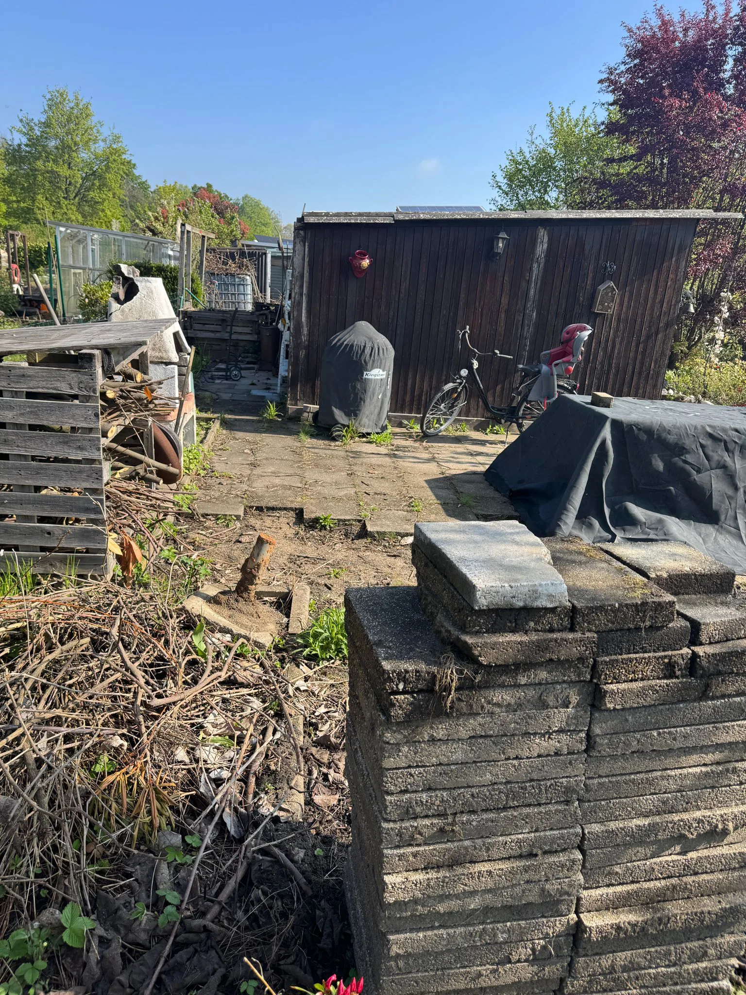 - Der in die Erde eingelassene 1000 Liter-Tank an der linken Laubenseite ist auszugraben. Das Loch ist zu verfüllen.
